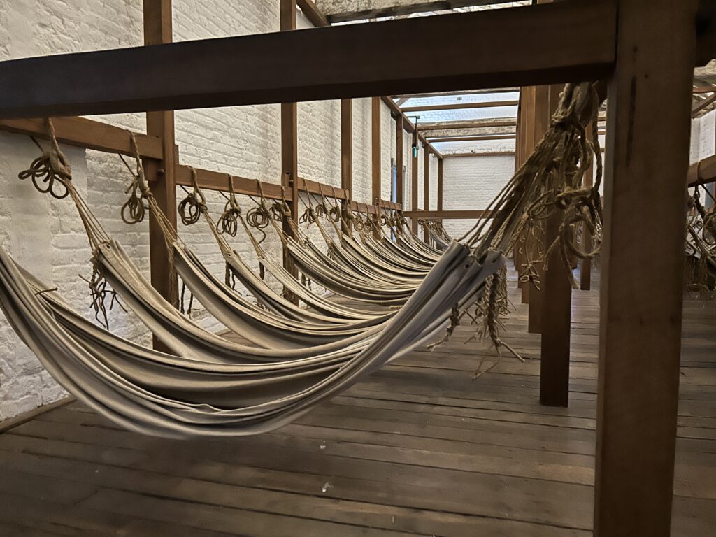 バラックスはそれほど大きくないですし、廊下は狭く、部屋は収容人数に対して広いとは言い難い造りです。ハンモックもこの写真のような密度で設置されており、ヨーロッパ人の体格を考えると相当ぎちぎちだったのではと想像できます。当然お風呂やシャワーもないため、衛生面はひどいものだったでしょう。