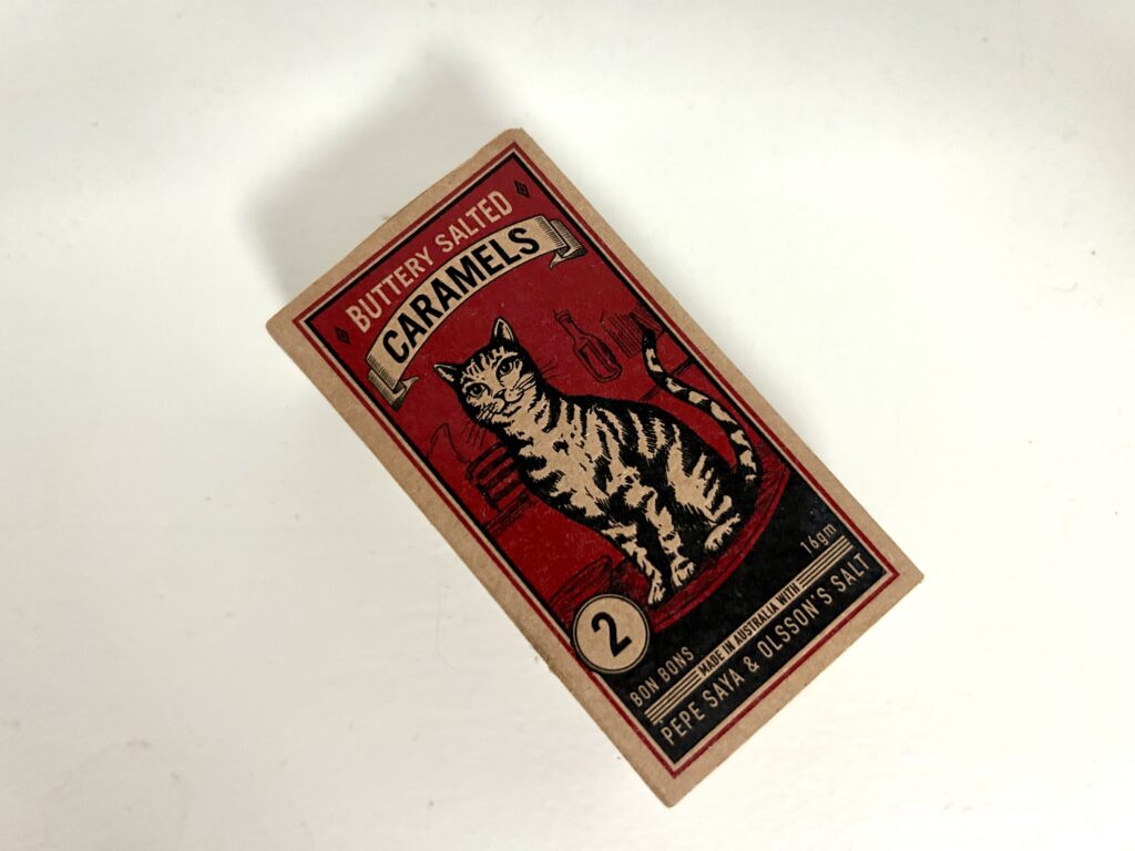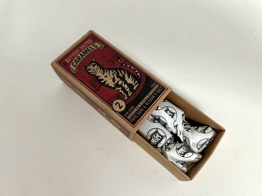 これまたキリリとキメ顔の猫に包まれたキャラメルが2粒。